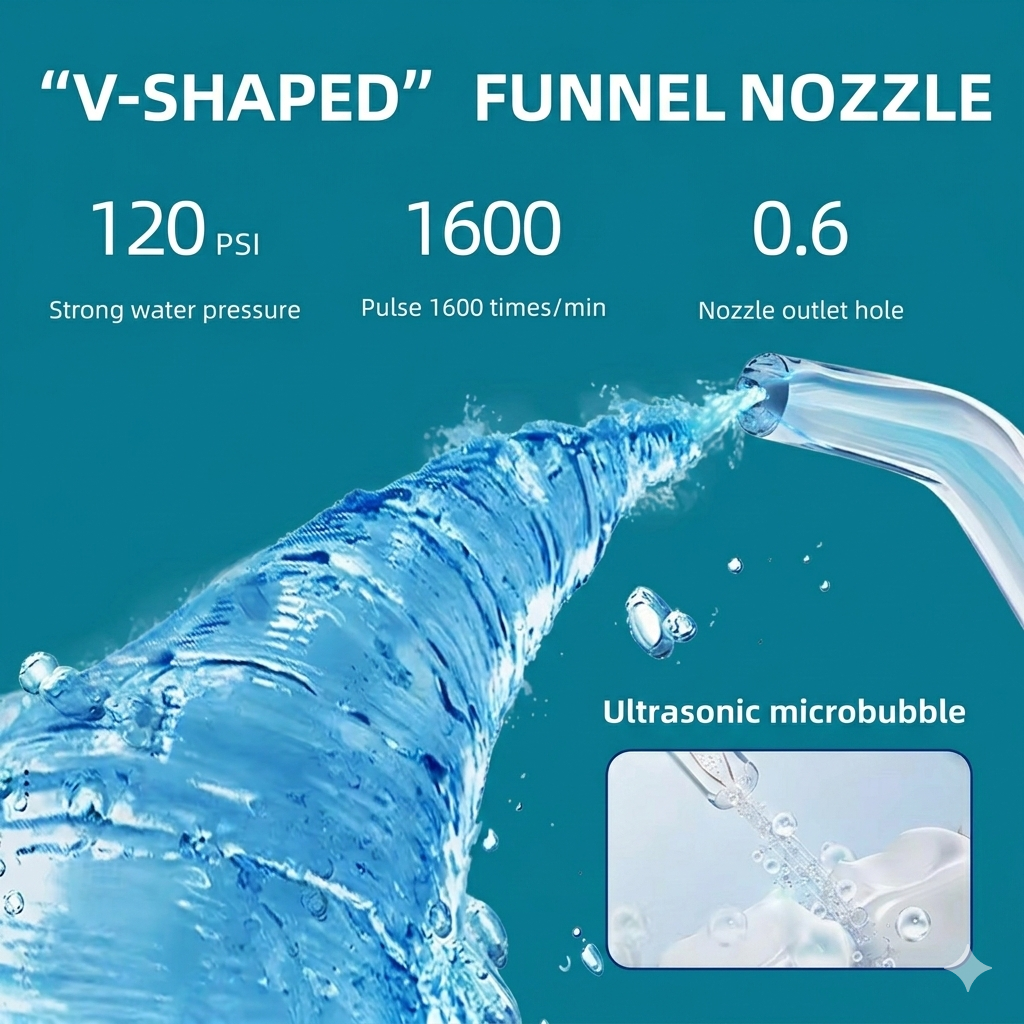 The package includes 5 interchangeable nozzles for different cleaning needs, making it suitable for daily oral hygiene, gum care, and maintaining fresh breath.