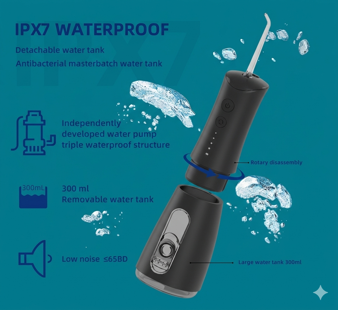 The flosser features 4 smart cleaning modes (Soft, Standard, High, and Pulse) to suit different oral care needs, from gentle gum care to deep cleaning. Its large 300ml detachable water tank allows longer flossing without frequent refills, while the 360° rotatable nozzle ensures easy access to every corner of your mouth.