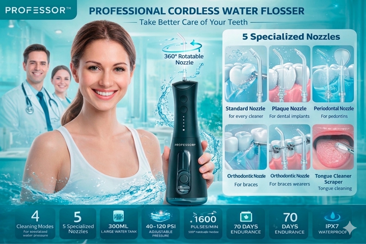 Upgrade your daily oral care routine with the Professor Premium Cordless Water Flosser, designed for powerful and effective deep cleaning. Using advanced pulsating water technology with up to 1600 pulses per minute, it removes plaque, food particles, and bacteria from between teeth and below the gumline—areas that brushing alone cannot reach.